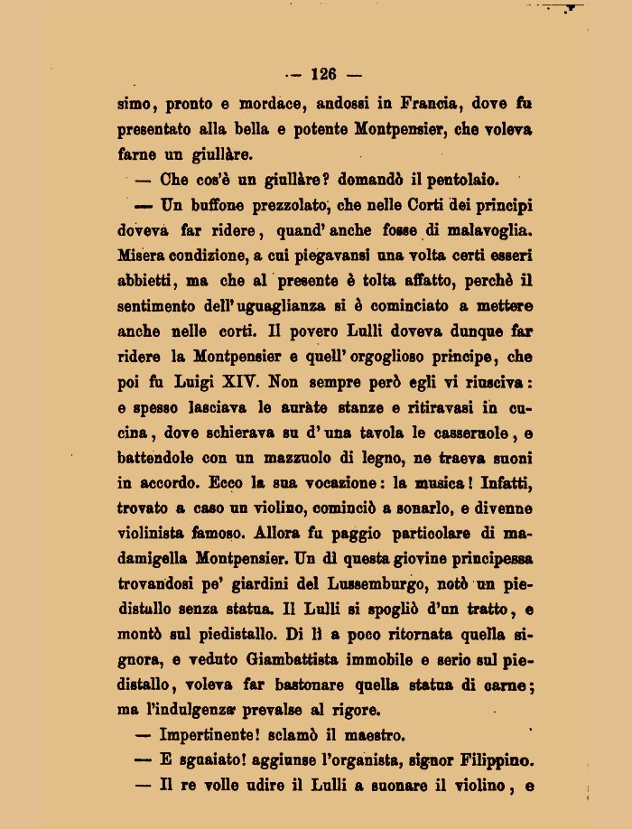— Un buffone prezzolato; che nelle Corti dei prìncipi doveva far ridere, quand'anche fosse di malavoglia. Misera condizione, a cui piegavansi una volta certi esseri abbietti, ma che al presente è tolta affatto, perchè il sentimento dell'uguaglianza si è cominciato a mettere anche nelle corti. Il povero Lulli doveva dunque far ridere la Montpensier e quell' orgoglioso principe, che poi fu Luigi XIY. Non sempre però egli vi riusciva : e spesso lasciava le aurate stanze e ritiravasi in cucina , dove schierava su d'una tavola le casseruole, e battendole con un mazzuolo di legno, ne traeva suoni in accordo. Ecco la sua vocazione: la musica! Infatti, trovato a caso un violino, cominciò a sonarlo, e divenne violinista famoso. Allora fu paggio particolare di madamigella Montpensier. Un di questa giovine principessa trovandosi pe' giardini del Lussemburgo, notò un piedistallo senza statua. Il Lulli si spogliò d'un tratto, e montò sul piedistallo. Di lì a poco ritornata quella signora, e veduto Giambattista immobile e serio sul piedistallo, voleva far bastonare quella statua di carne; ma l'indulgenza? prevalse al rigore.