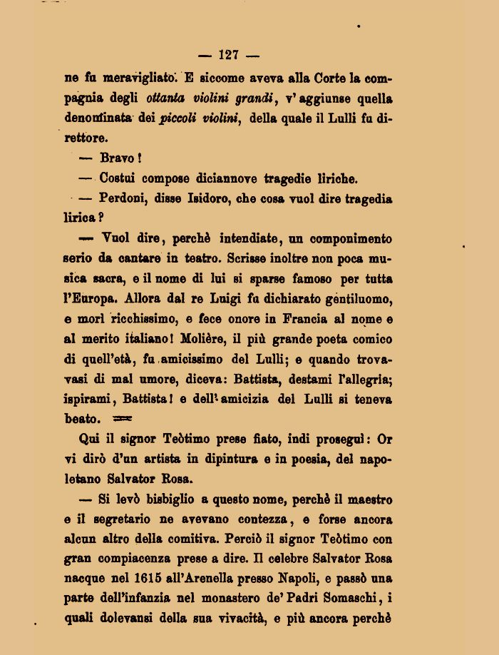 — Vuol dire, perchè intendiate, un componimento serio da cantare in teatro. Scrisse inoltre non poca musica sacra, e il nome di lui si sparse famoso per tutta l'Europa. Allora dal re Luigi fu dichiarato gentiluomo, e morì ricchissimo, e fece onore in Francia al nome e al merito italiano! Molière, il più grande poeta comico di quell'età, fu amicissimo del Lulli; e quando trova-vasi di mal umore, diceva: Battista, destami l'allegria; ispirami, Battista! e dell'amicizia del Lulli si teneva beato.