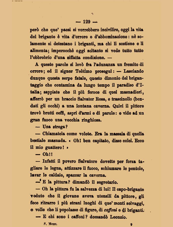A queste parole si levò fra l'adunanza un fremito di orrore ; ed il signor Teòtimo prosegui : — Lasciando dunque questa serpe fatale, questo dimonio del brigantaggio che contamina da lungo tempo il paradiso d'Italia; sappiate che il più feroce di quei masnadieri, afferrò per un braccio Salvator Rosa, e trascinollo (bendati gli occhi) a una lontana caverna. Quivi il pittore trovò brutti ceffi, aspri d'armi e di parole : e vide ad un gran fuoco una vecchia ringhiosa.