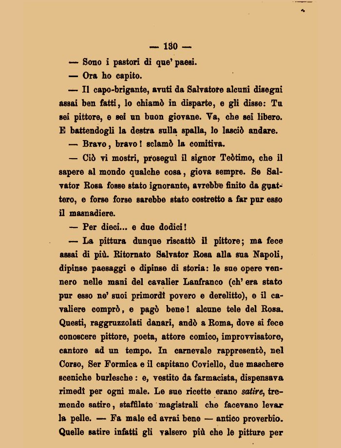 — Ciò vi mostri, proseguì il signor Teòtimo, che il sapere al mondo qualche cosa, giova sempre. Se Salvator Rosa fosse stato ignorante* avrebbe finito da ggat-tero, e forse forse sarebbe stato costretto a far pur esso il masnadiere.
