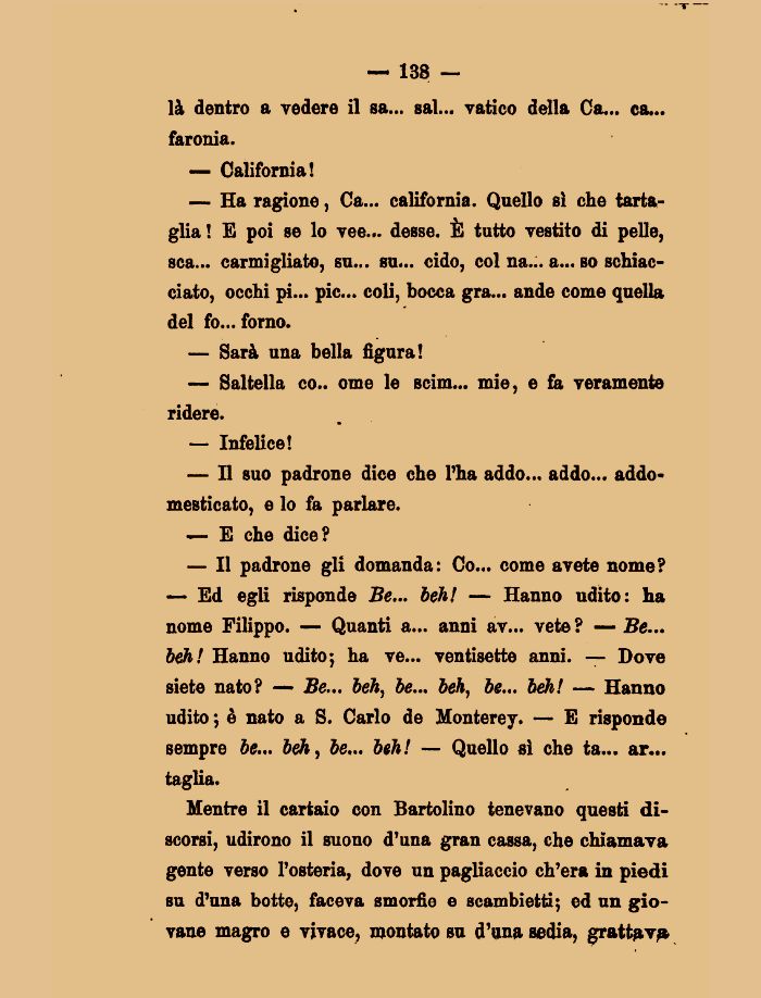 Il padrone gli domanda: Co... come avete nome? Ed egli risponde Be... beh! Hanno udito: ha nome Filippo. Quanti a... anni av... vete? Be... beh! Hanno udito; ha ve... ventisette anni. Dove siete nato? Be... beh, be... beh, be... beh! Hanno udito ; θ nato a S. Carlo de Monterey. E risponde sempre be... beh, be... beh! Quello sμ che ta... ar... taglia.