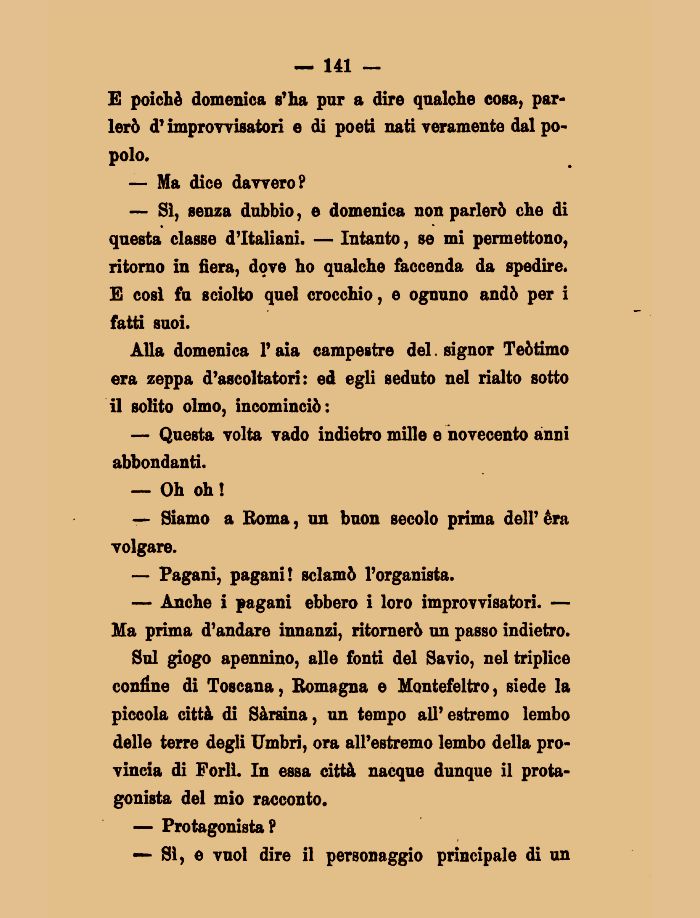 Sul giogo apennino, alle fonti del Savio, nel triplice contine di Toscana, Romagna e Montefeltro, siede la piccola città di Sàrsina, un tempo all'estremo lembo delle terre degli Umbri, ora all'estremo lembo della provincia di Forlì. In essa città nacque dunque il protagonista del mio racconto.