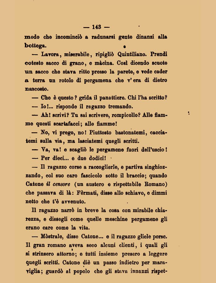 — Lavora, miserabile, ripigliò Quintiliano. Prendi cotesto sacco di grano, e màcina. Cosi dicendo scuote un sacco che stava ritto presso la parete, e vede cader a terra un rotolo di pergamena che v'era di dietro nascosto.