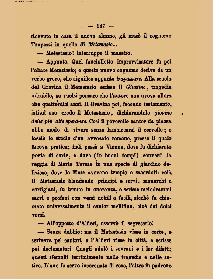 — Senza dubbio: ma il Metastasio visse in corte, e scriveva pe' cantori, e l'Alfieri visse in città, e scrisse pei declamatori. Quegli adulò i sovrani e i lor difetti; quésti sferzolli terribilmente nelle tragedie e nelle satire. L'uno fu servo incoronato di rose, l'altro fti padrone