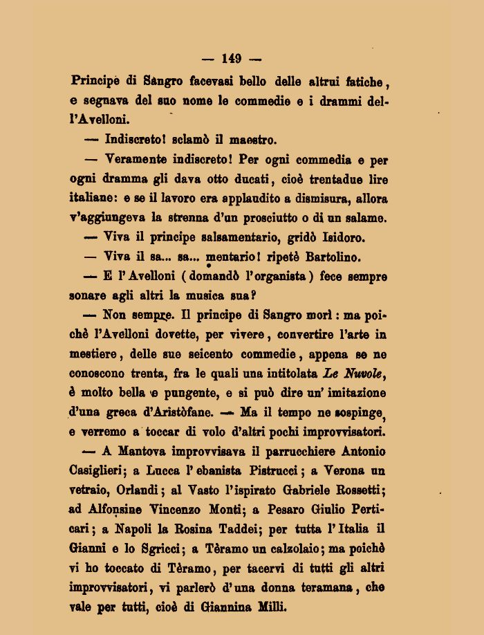 — Veramente indiscreto! Per ogni commedia e per ogni dramma gli dava otto ducati, cioè trentadue lire italiane: e se il lavoro era applaudito a dismisura, allora v'aggiungeva la strenna d'un prosciutto o di un salame.