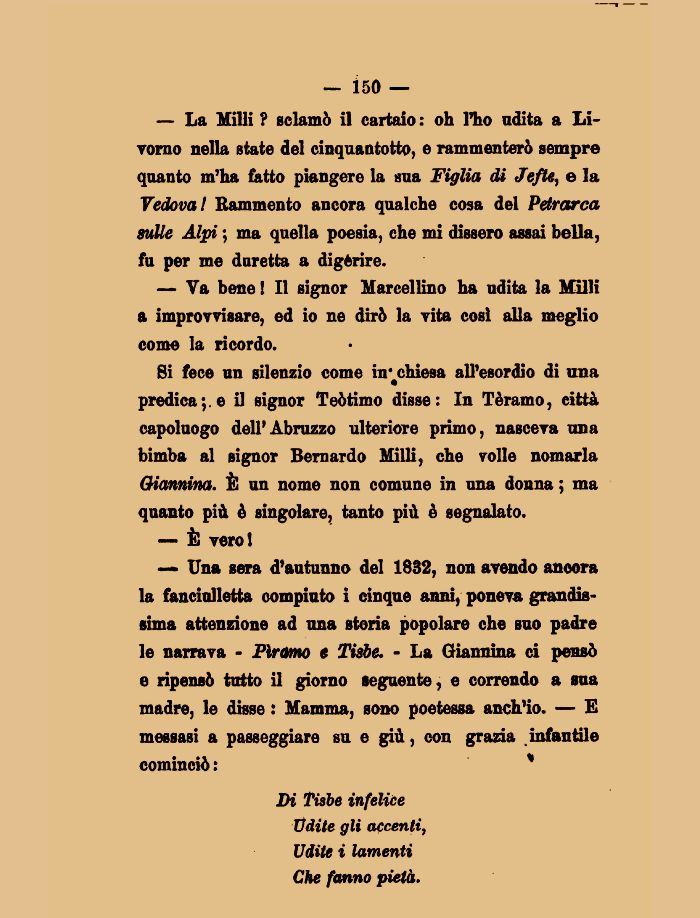 —» Una sera d'autunno del 1832, non avendo ancora la fanciulletta compiuto i cinque anni, poneva grandissima attenzione ad una storia popolare che suo padre le narrava - Firmo e Tisbe. - La Giannina ci pensò e ripensò tutto il giorno seguente, e correndo a sua madre, le disse : Mamma, sono poetessa anch'io. — E messasi a passeggiare su e giù, con grazia infantile cominciò : *