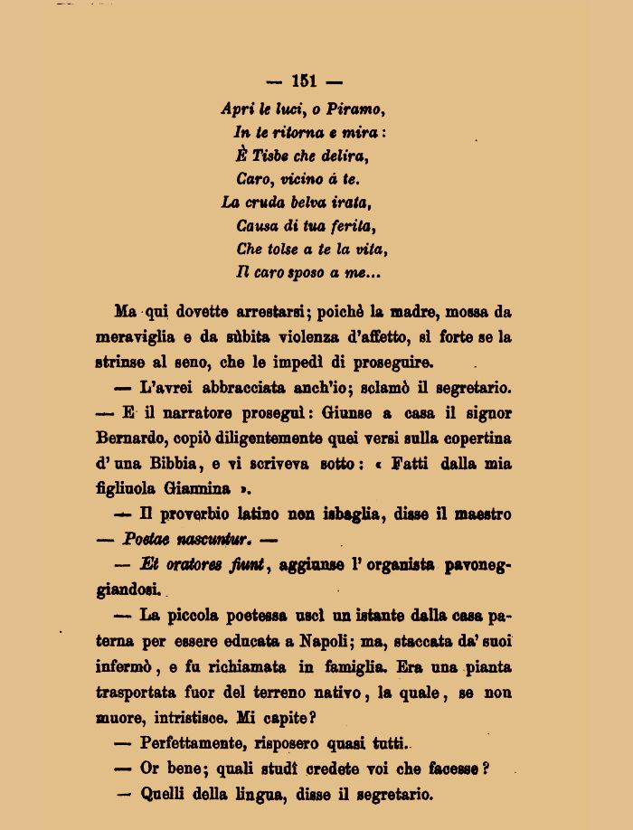 — La piccola poetessa usci un istante dalla casa paterna per essere educata a Napoli; ma, staccata da' suoi infermò, e fu richiamata in famiglia. Era una pianta trasportata fuor del terreno nativo, la quale, se non muore, intristisce. Mi capite?