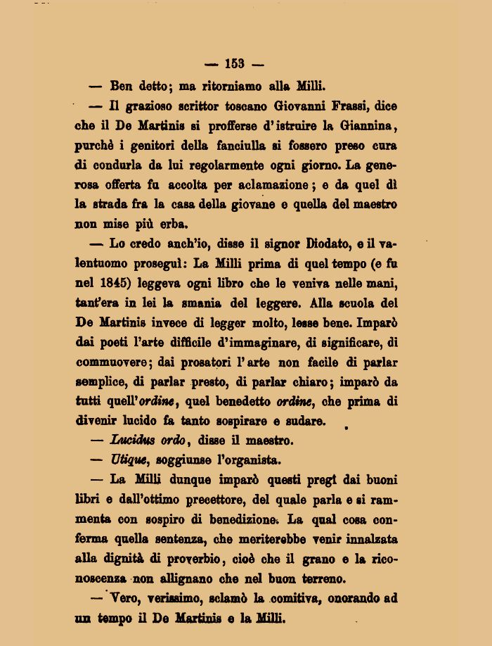 — Lo credo anch'io, disse il signor Diodato, e il valentuomo proseguì: La Milli prima di quel tempo (e fu nel 1845) leggeva ogni libro che le veniva nelle mani, tanfera in lei la smania del leggere. Alla scuola dei De Martinis invece di legger molto, lesse bene. Imparò dai poeti l'arte difficile d'immaginare, di significare, di commuovere; dai prosatori l'arte non facile di parlar semplice, di parlar presto, di parlar chiaro ; imparò da tutti quell'orda, quel benedetto ordine, che prima di divenir lucido fa tanto sospirare e sudare.