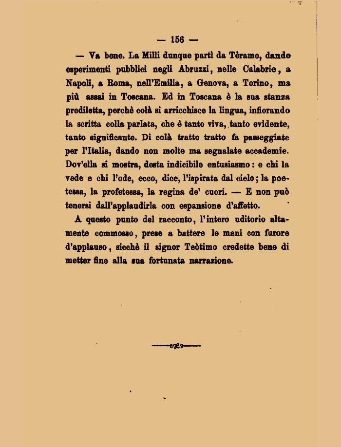 — Va bene. La Milli dunque parti da Tèramo, dando esperimenti pubblici negli Abruzzi, nelle Calabrie, a Napoli, a Roma, nell'Emilia, a Genova, a Torino, ma più assai in Toscana. Ed in Toscana è la sua stanza prediletta, perchè colà si arricchisce la lingua, infiorando la scrìtta colla parlata, che è tanto viva, , tanto evidente, tanto significante. Di colà tratto tratto & passeggiate per l'Italia, dando non molte ma segnalate accademie. Dov'ella si mostra, desta indicibile entusiasmo : e chi la vede e chi l'ode, ecco, dice, l'ispirata dal cielo ; la poetessa, la profetessa, la regina de' cuori. — E non può tenersi dall'applaudirla con espansione d'affetto.