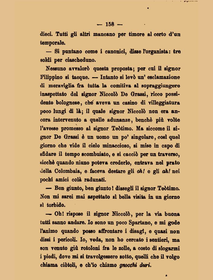 Nessuno avvalorò questa proposta; per cui il signor Filippino si tacque. — Intanto si levò un' esclamazione di meraviglia fra tutta la cognitiva al sopraggiungere inaspettato del signor Niccolò De Grassi, ricco possidente bolognese, che* aveva un casino di villeggiatura poco lungi di là; il quale signor Niccolò non era ancora intervenuto a quelle adunanze, benché più volte l'avesse promesso al signor Teòtimo. Ma siccome il signor De Grassi è un uomo un po' singolare, cosi quel giorno che vide il cielo minaccioso, si mise in capo di sfidare il tempo scombuiato, e si cacciò per un traverso, sicché quando niuno poteva crederlo, entrava nel prato della Colombaia, e faceva destare gli ohi e gli ahi nei pochi amici colà radunati.