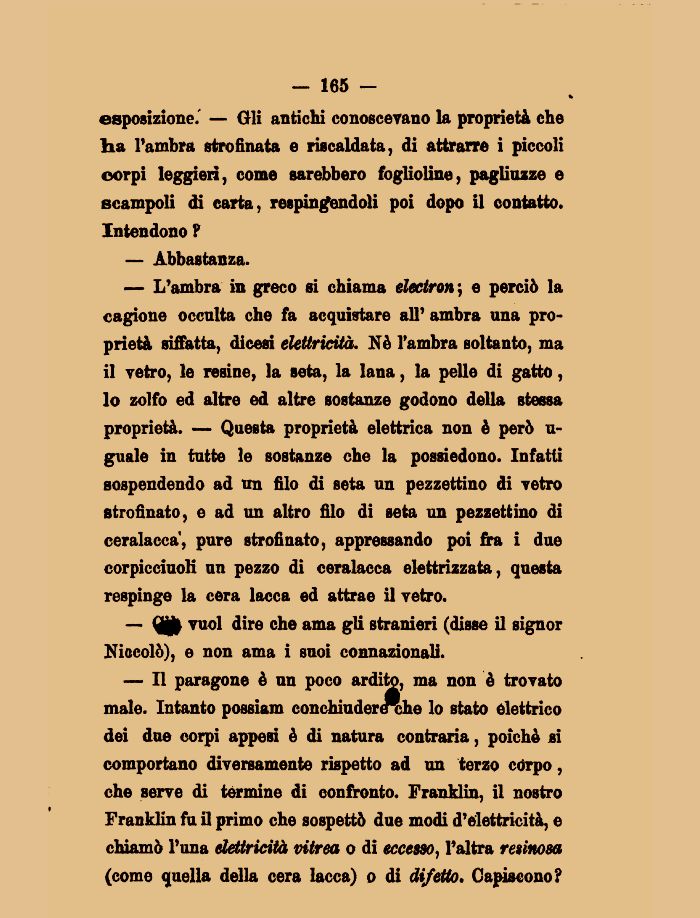 — L'ambra in greco si chiama electron', e perciò la cagione occulta che fa acquistare all' ambra una proprietà siffatta, dicesi elettricità. Nè l'ambra soltanto, ma il vetro, le resine, la seta, la lana, la pelle di gatto, lo zolfo ed altre ed altre sostanze godono della stessa proprietà. — Questa proprietà elettrica non è però u-guale in tutte le sostanze che la possiedono. Infatti sospendendo ad un filo di seta un pezzettino di vetro strofinato, e ad un altro filo di seta un pezzettino di ceralacca, pure strofinato, appressando poi fra i due corpicciuoli un pezzo di ceralacca elettrizzata, questa respinge la cera lacca ed attrae il vetro.