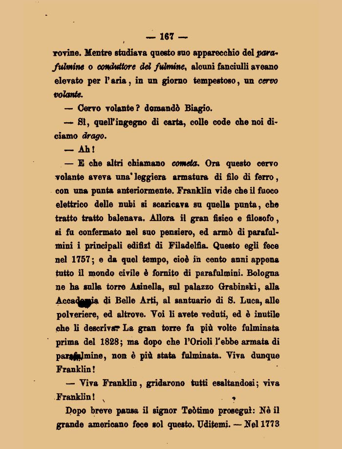 — E che altri chiamano cometa. Ora questo cervo volante aveva una* leggiera armatura di filo di ferro, con una punta anteriormente. Franklin vide che il fuoco elettrico delle nubi si scaricava su quella punta, che tratto tratto balenava. Allora il gran fisico e filosofo, si fu confermato nel suo pensiero, ed armò di parafulmini i principali edilizi di Filadelfia. Questo egli fece nel 1757; e da quel tempo, cioè in cento anni appena tutto il mondo civile è fornito di parafulmini. Bologna ne ha sulla torre Asinella, sul palazzo Grabinski, alla Accappia di Belle Arti, al santuario di S. Luca, alle polveriere, ed altrove. Toi li avete veduti, ed è inutile che li descriva? La gran torre fu più volte fulminata prima del 1828; ma dopo che l'Orioli l'ebbe armata di parafulmine, non è più stata fulminata. Yiva dunque Franklin !