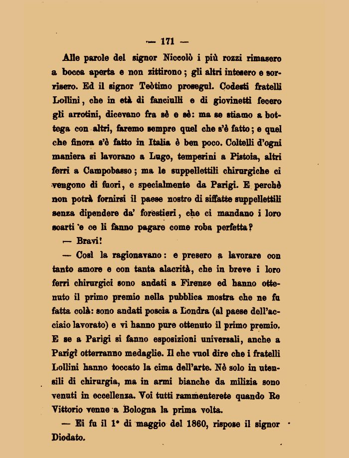 — Così la ragionavano : e presero a lavorare con tanto amore e con tanta alacrità, che in breve i loro ferri chirurgici sono andati a Firenze ed hanno ottenuto il primo premio nella pubblica mostra che ne fu fatta colà: sono andati poscia a Londra (al paese dell'acciaio lavorato) e vi hanno pure ottenuto il primo premio. E se a Parigi si fanno esposizioni universali, anche a Parigi otterranno medaglie. Il ehe vuol dire che i fratelli Lollini hanno toccato la cima dell'arte. Nè solo in utensili di chirurgia, ma in armi bianche da milizia sono venuti in eccellenza. Voi tutti rammenterete quando Re Vittorio venne a Bologna la prima volta.