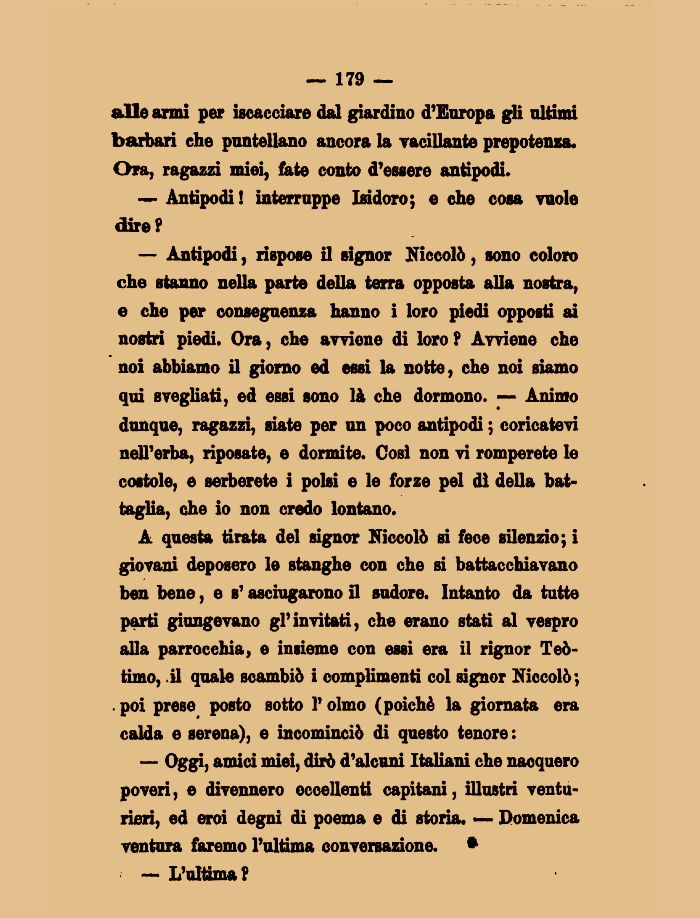 — Antipodi, rispose il signor Niccolò, sono coloro che stanno nella parte della terra opposta alla nostra, e che per conseguenza hanno i loro piedi opposti ai nostri piedi. Ora, che avviene di loro ? Avviene che noi abbiamo il giorno ed essi la notte, che noi siamo qui svegliati, ed essi sono là che dormono. — Animo dunque, ragazzi, siate per un poco antipodi ; coricatevi nell'erba, riposate, e dormite. Cosi non vi romperete le costole, e serberete i polsi e le forze pel dì della battaglia, che io non credo lontano.
