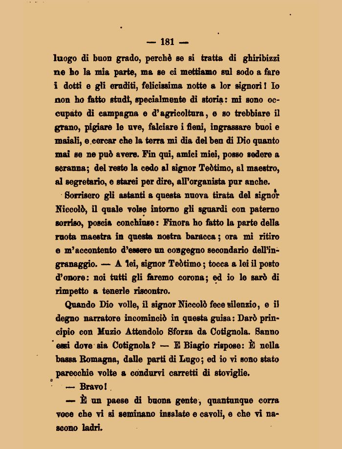 Quando Dio volle, il signor Niccolò fece silenzio, e il degno narratore incominciò in questa guisa : Darò principio con Muzio Attendolo Sforza da Cotignola. Sanno essi dove sia Cotignola ? — E Biagio rispose: È nella bassa Romagna, dalle parti di Lugo; ed io vi sono stato parecchie volte a cóndurvi carretti di stoviglie.