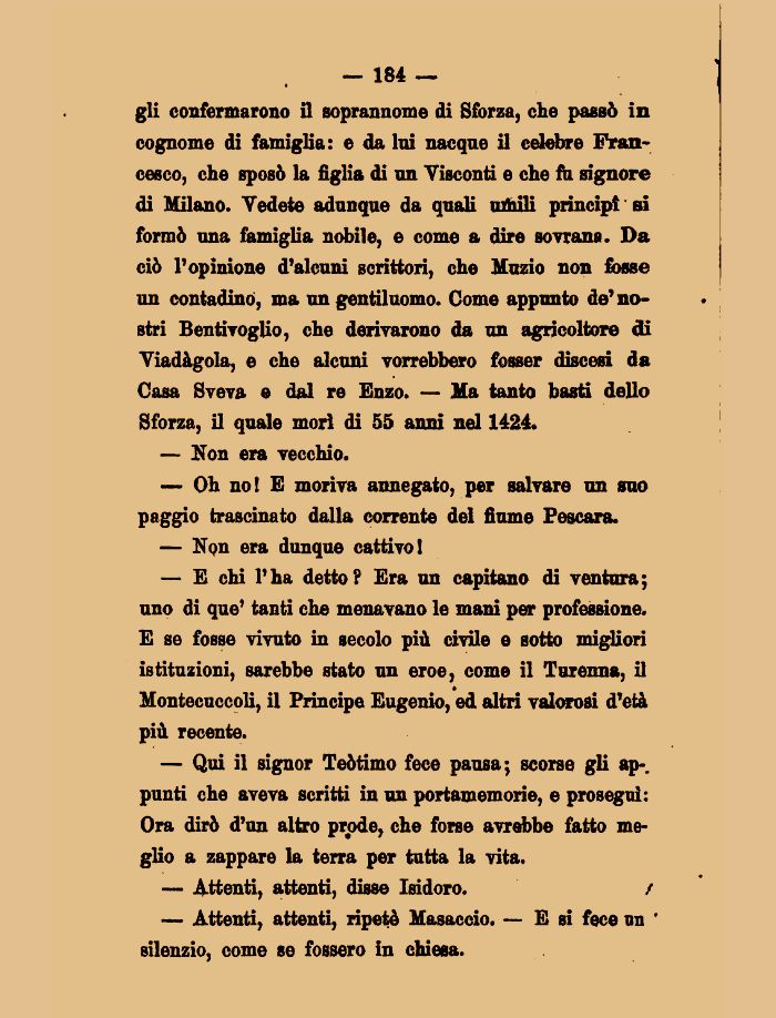 — E chi l'ha detto? Era un capitano di ventura; uno di que' tanti che menavano le mani per professione. E se fosse vivuto in secolo più civile e sotto migliori istituzioni, sarebbe stato un eroe, come il Turenna, il Montecuccoli, il Principe Eugenio, ed altri valorosi d'età più recente.