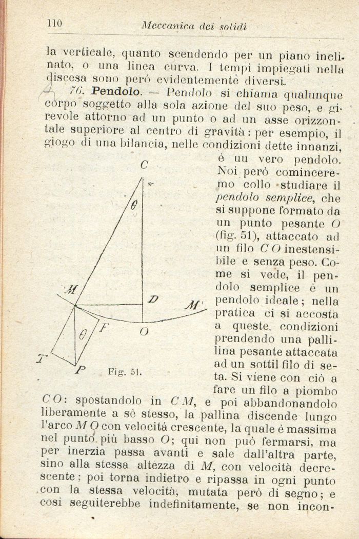 é uu vero pendolo. Noi però cominceremo collo studiare il pendolo semplice, che si suppone l'ormato da un punto pesante. O (fig. 51), attaccato ad un filo C O inestensibile e senza peso. Come si vede, il pendolo semplice è un pendolo ideale ; nella pratica ci si accosta a queste, condizioni prendendo una palli-lina pesante attaccata ad un sottil filo di seta. Si viene con ciò a fare un filo a piombo poi abbandonandolo