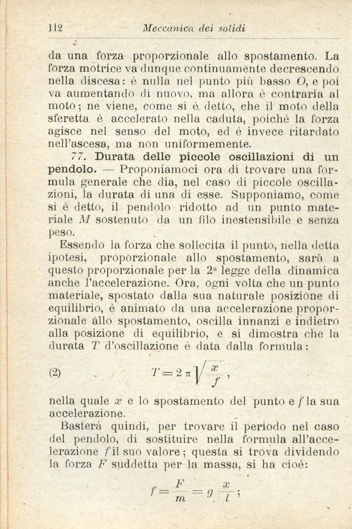 Essendo la forza che sollecita il punto, nella detta ipotesi, proporzionale allo spostamento, sarà a questo proporzionale per la 211 legge della dinamica anche l'accelerazione. Ora, ogni volta che un punto materiale, spostato dalla sua naturale posizione di equilibrio, è animato da una accelerazione proporzionale allo spostamento, oscilla innanzi e indietro alla posizione di equilibrio, e si dimostra che la durata T d'oscillazione è data dalla formula :