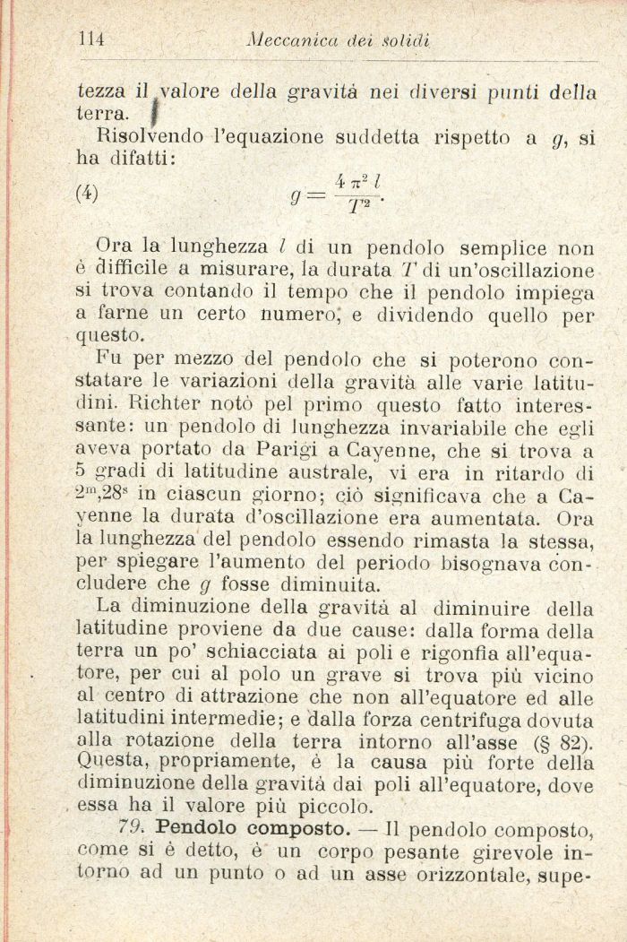 La diminuzione della gravità al diminuire della latitudine proviene da due cause: dalla forma della terra un po' schiacciata ai poli e rigonfia all'equatore, per cui al polo un grave si trova più vicino al centro di attrazione che non all'equatore ed alle latitudini intermedie; e dalla forza centrifuga dovuta alla rotazione della terra intorno all'asse (§ 82). Questa, propriamente, è la causa più forte della diminuzione della gravità dai poli all'equatore, dove essa ha il valore più piccolo.