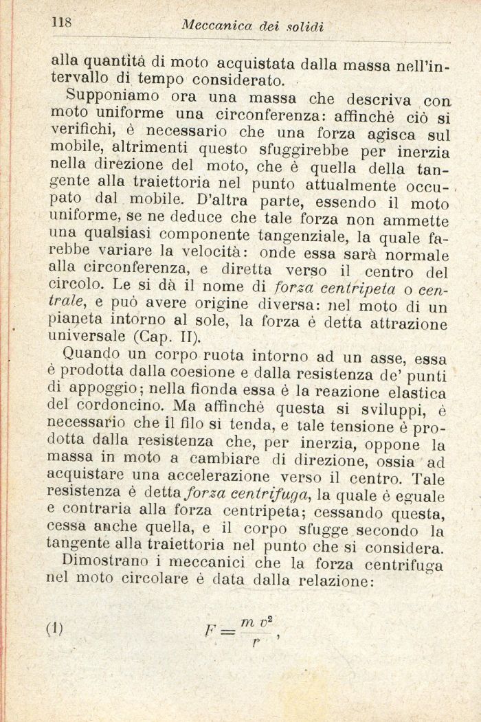 Supponiamo ora una massa che descriva con moto uniforme una circonferenza: affinchè ciò si verifichi, è necessario che una forza agisca sul mobile, altrimenti questo sfuggirebbe per inerzia nella direzione del moto, che è quella della tangente alla traiettoria nel punto attualmente occupato dal mobile. D'altra parte, essendo il moto uniforme, se ne deduce che tale forza non ammette una qualsiasi componente tangenziale, la quale farebbe variare la velocità: onde essa sarà normale alla circonferenza, e diretta verso il centro del circolo. Le si dà il nome di forza centripeta o centrale, e può avere origine diversa: nel moto di un pianeta intorno al sole, la forza è detta attrazione universale (Cap. II).