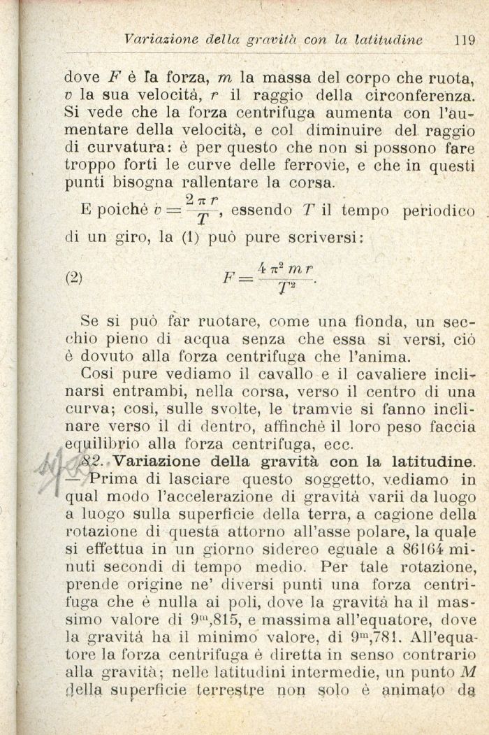 I — Prima di lasciare questo soggetto, vediamo in qual modo l'accelerazione di gravità varii da luogo a luogo sulla superficie della terra, a cagione della rotazione di questa attorno all'asse polare, la quale si effettua in un giorno sidereo eguale a 86104 minuti secondi di tempo medio. Per tale rotazione, prende origine ne' diversi punti una forza centrifuga che è nulla ai poli, dove la gravità ha il massimo valore di 9',815, e massima all'equatore, dove la gravità ha il minimo valore, di 9m,781. All'equatore la forza centrifuga è diretta in senso contrario alla gravità; nelle latitudini intermedie, un punto M della superficie terrestre non sojo è animato da