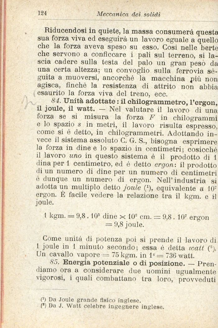 84. Unità adottate : il chilogrammetro, l'ergon, il joule, il watt. — Nel valutare il lavoro di una forza se si misura la forza F in chilogrammi e lo spazio s in metri, il lavoro risulta espresso, come si é detto, in chilogrammetri. Adottando invece il sistema assoluto C. G. S., bisogna esprimere la forza in dine e lo spazio in centimetri; cosicché il lavoro uno in questo sistema è il prodotto di 1 dina per 1 centimetro, ed è detto ergon: il prodotto di un numero di dine per un numiro di centimetri è dunque un numero di ergon. Nell'industria si adotta un multiplo detto joule (*), equivalente a IO7 ergon. È facile vedere la relazione tra il kgm. e il joule.