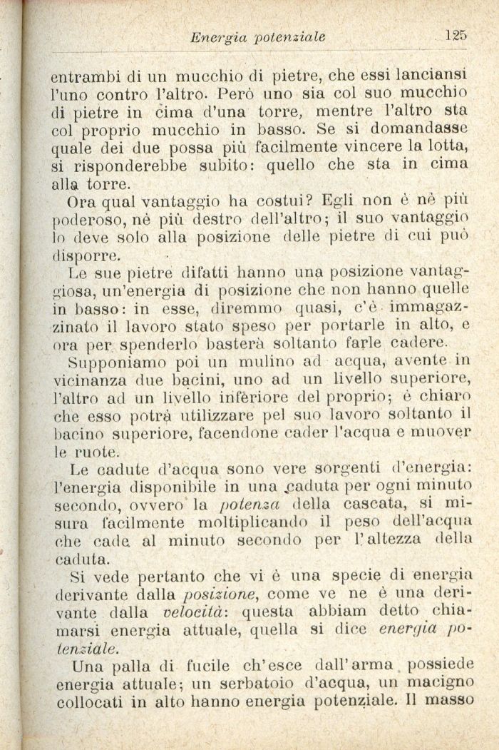 Si vede pertanto che vi è una specie di energia derivante dalla posizione, come ve ne è una derivante dalla velocità-, questa abbiam detto chiamarsi energia attuale, quella si dice energia />o-ienziale.