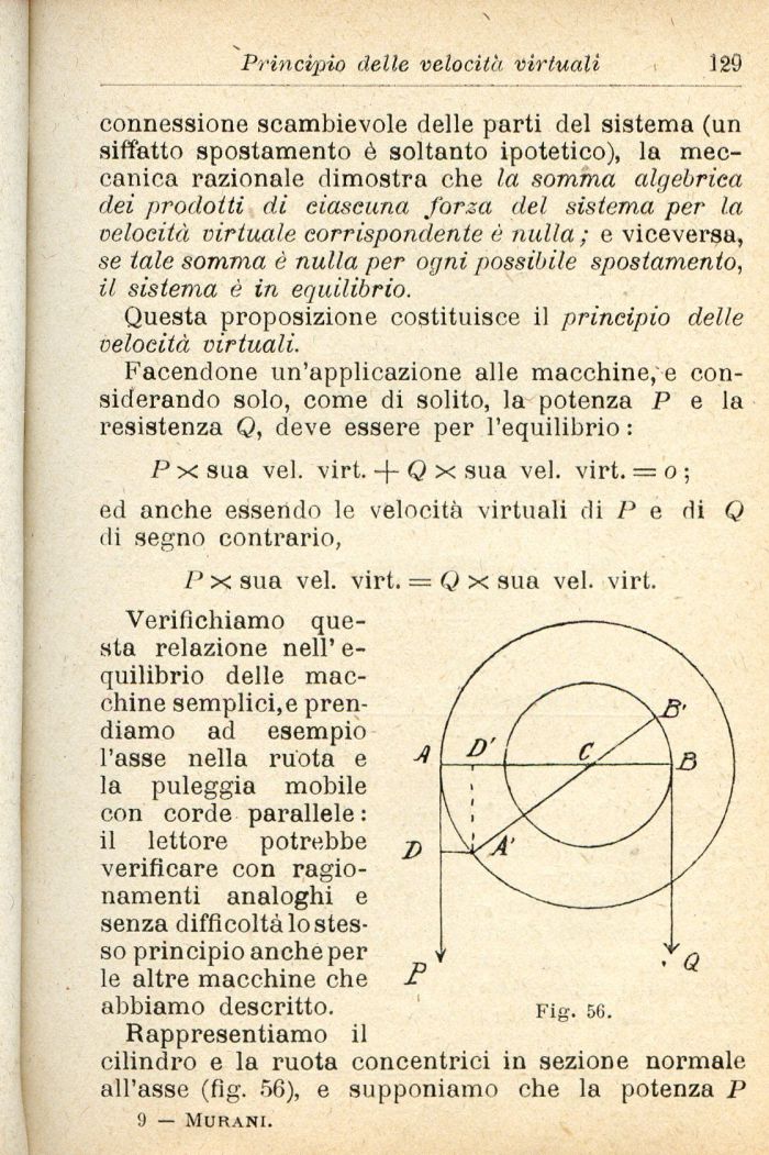 Verifichiamo questa relazione nell' e-quilibrio delle macchine semplici,e prendiamo ad esempio l'asse nella ruota e la puleggia mobile con corde parallele : il lettore potrebbe verificare con ragionamenti analoghi e senza difficoltà lo stesso principio anche per le altre macchine che abbiamo descritto.