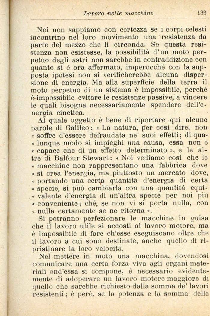 Al quale oggetto è bene di riportare qui alcune parole di Galileo : « La natura, per cosi dire, non « soffre d'essere defraudata ne' suoi effetti; di qua-- lunque modo si impieghi una causa, essa non è « capace che di un effetto determinato », e le altre di Balfour Stewart: « Noi vediamo cosi che le « macchine non rappresentano una fabbrica dove « si crea l'energia, ma piuttosto un mercato dove, « portando una cer^a quantità d'energia di certa « specie, si può cambiarla con una quantità equi-« valente d'energia di un'altra specie per noi più « conveniente; chè, se non vi si porta nulla, con « nulla certamente se ne ritorna ».