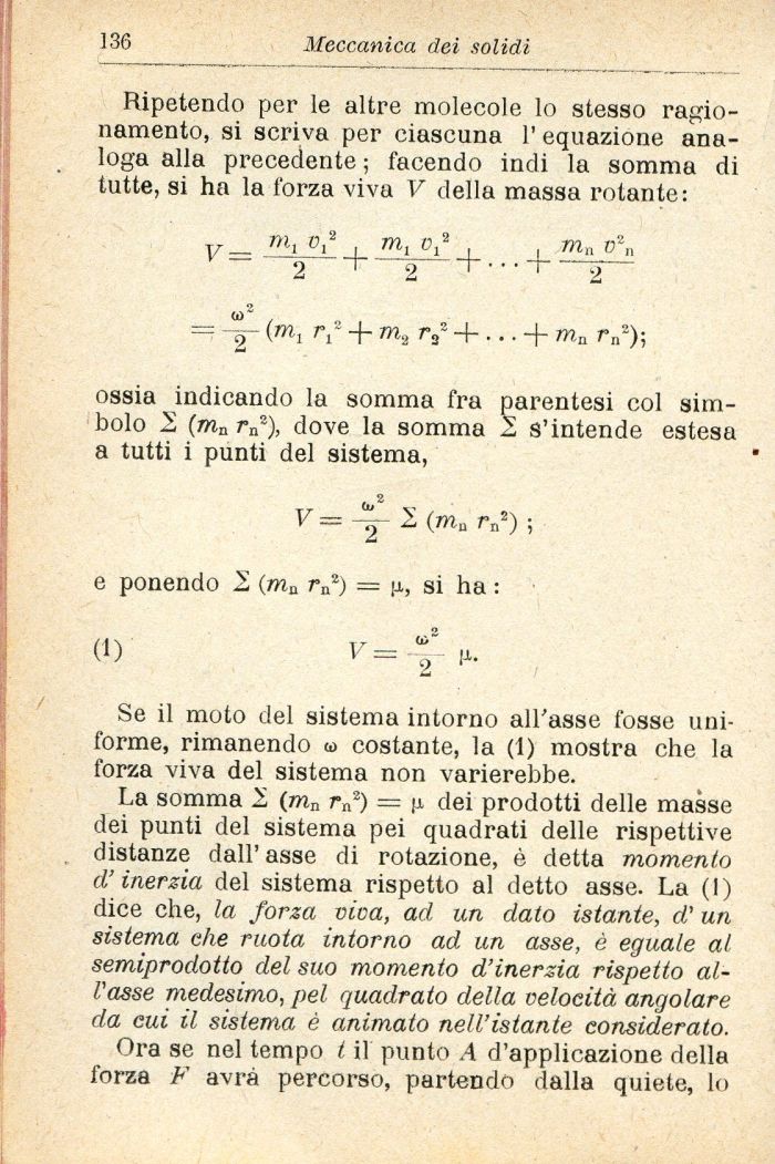 La somma 2 (mn r„2) = ,i dei prodotti delle masse dei punti del sistema pei quadrati delle rispettive distanze dall' asse di rotazione, è detta momento d'inerzia del sistema rispetto al detto asse. La (1) dice che, la forza viva, ad un dato istante, d' un sistema che ruota intorno ad un asse, è eguale al semiprodotto del suo momento d'inerzia rispetto all'asse medesimo, pel quadrato della velocità angolare da cui il sistema è animato nell'istante considerato.