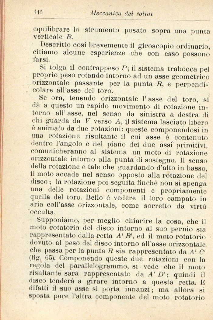 Se ora, tenendo orizzontale l'asse del toro, si dà a questo un rapido movimento di rotazione intorno all' asse, nel senso da sinistra a destra di chi guarda da V verso A, il sistema lasciato libero è animato da due rotazioni: queste componendosi in una rotazione risultante il cui asse è contenuto dentro l'angolo e nel piano dei due assi primitivi, comunicheranno al sistema un moto di rotazione orizzontale intorno alla punta di sostegno. 11 senso della rotazione è tale che guardando d'alto in basso, il moto accade nel senso opposto alla rotazione del disco ; la rotazione poi seguita finché non si spenga una delle rotazioni componenti e propriamente quella del toro. Bello è vedere il toro campato in aria coll'asse orizzontale, come sorretto da virtù occulta.
