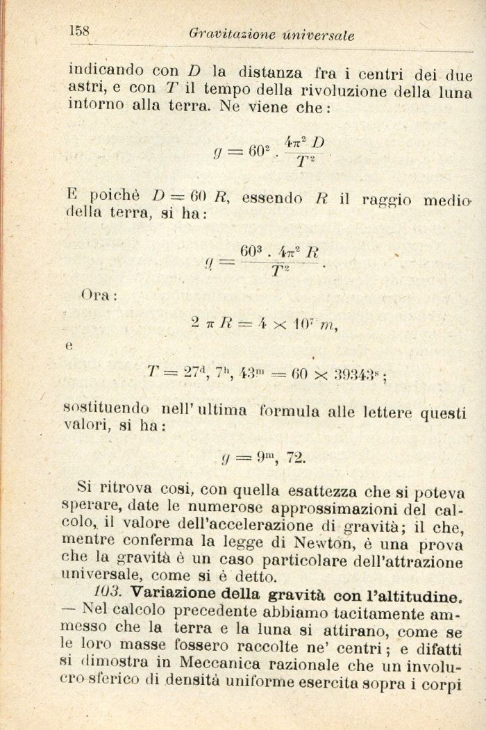 103. Variazione della gravità con l'altitudine. — Nel calcolo precedente abbiamo tacitamente ammesso che la terra e la luna si attirano, come se le loro masse fossero raccolte ne' centri ; e difatti si dimostra in Meccanica razionale che un involucro sferico di densità uniforme esercita sopra i corpi