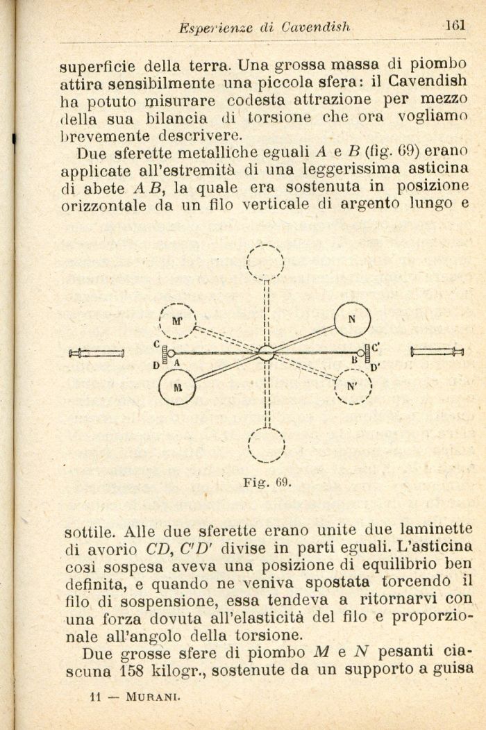 superficie della terra. Una grossa massa di piombo attira sensibilmente una piccola sfera: il Cavendish ha potuto misurare codesta attrazione per mezzo della sua bilancia di torsione che ora vogliamo brevemente descrivere.