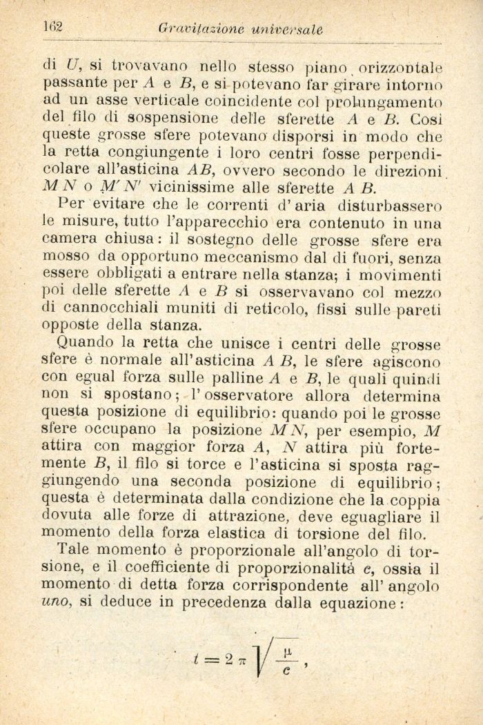Per evitare che le correnti d' aria disturbassero le misure, tutto l'apparecchio era contenuto in una camera chiusa : il sostegno delle grosse sfere era mosso da opportuno meccanismo dal di fuori, senza essere obbligati a entrare nella stanza; i movimenti poi delle sferette A e B si osservavano col mezzo di cannocchiali muniti di reticolo, fissi sulle pareti opposte della stanza.