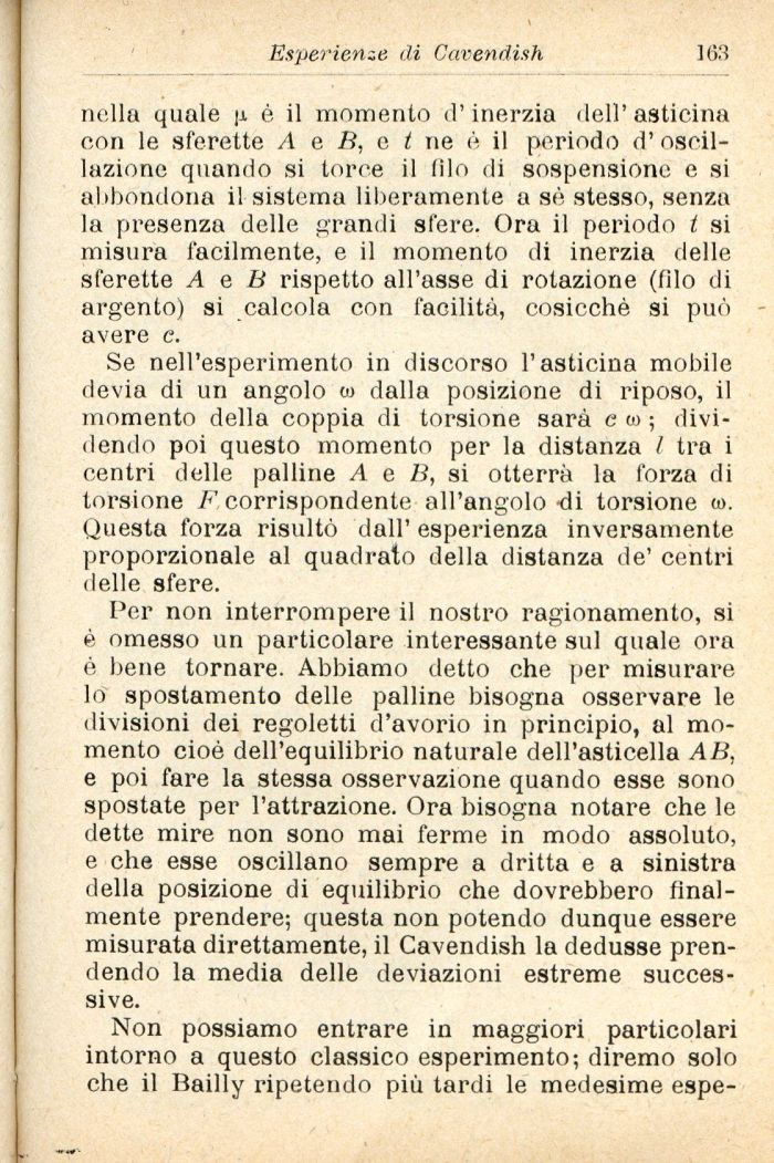 Per non interrompere il nostro ragionamento, si è omesso un particolare interessante sul quale ora è bene tornare. Abbiamo detto che per misurare lo spostamento delle palline bisogna osservare le divisioni dei regoletti d'avorio in principio, al momento cioè dell'equilibrio naturale dell'asticella AB, e poi fare la stessa osservazione quando esse sono spostate per l'attrazione. Ora bisogna notare che le dette mire non sono mai ferme in modo assoluto, e che esse oscillano sempre a dritta e a sinistra della posizione di equilibrio che dovrebbero finalmente prendere; questa non potendo dunque essere misurata direttamente, il Cavendish la dedusse prendendo la media delle deviazioni estreme successive.