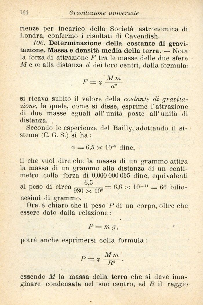 106. Determinazione della costante di gravitazione. Massa e densità media della terra. — Nota la forza di attrazione F tra le masse delle due sfere M em alla distanza d dei loro centri, dalla formula: