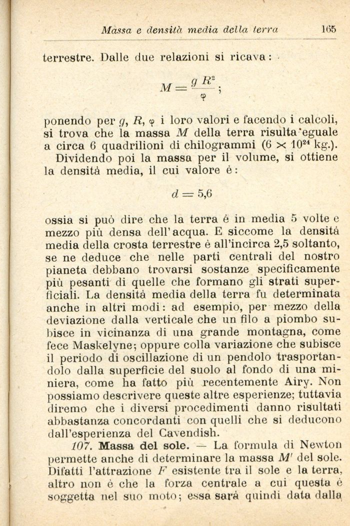 107. Massa del sole. — La formula di Newton permette anche di determinare la massa M' del sole. Difatti l'attrazione F esistente tra il sole e la terra, altro non è che la forza centrale a cui questa è soggetta nel suo moto; essa sarà quindi data dalla