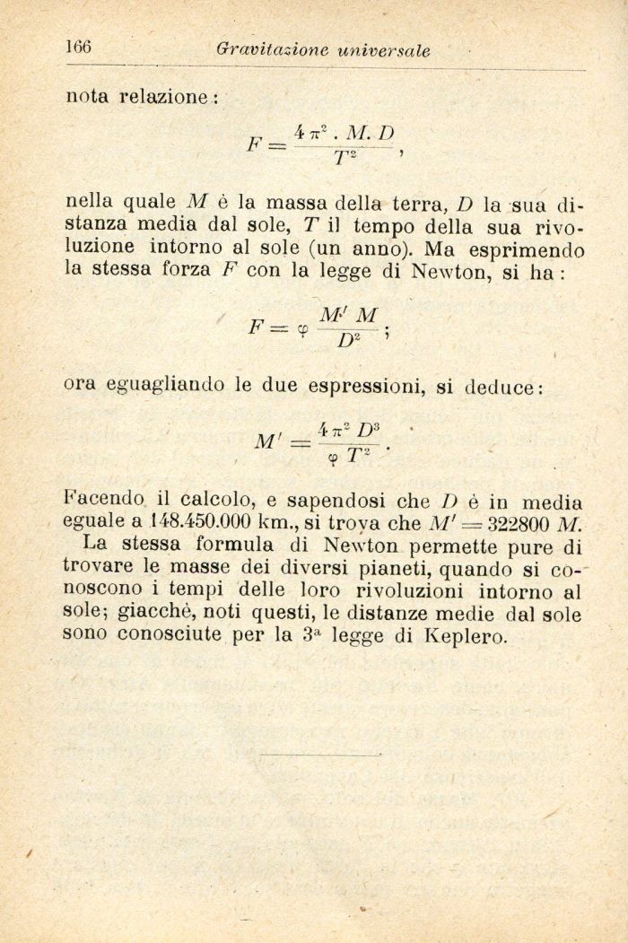 nella quale M è la massa della terra, d la sua distanza media dal sole, t il tempo della sua rivoluzione intorno al sole (un anno). Ma esprimendo la stessa forza f con la legge di Newton, si ha :