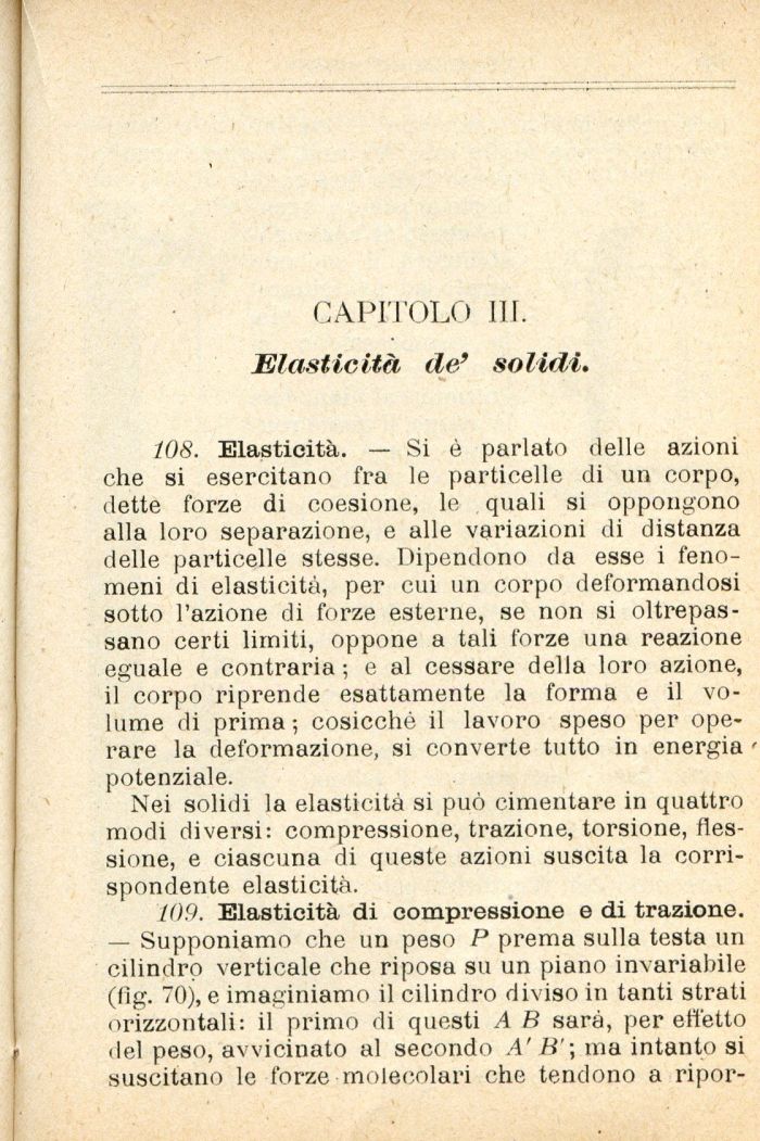 109. Elasticità di compressione e di trazione. — Supponiamo che un peso P prema sulla testa un cilindro verticale che riposa su un piano invariabile (fig. 70), e imaginiamo il cilindro diviso in tanti strati orizzontali: il primo di questi A B sarà, per effetto del peso, avvicinato al secondo A' B'\ ma intanto si suscitano le forze molecolari che tendono a ripor-