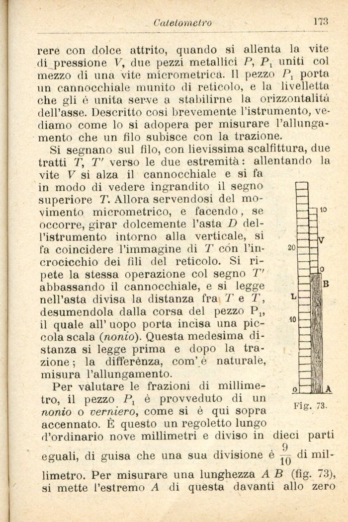 eguali, di guisa che una sua divisione è ^ di millimetro. Per misurare una lunghezza A B (fig. 73), si mette l'estremo A di questa davanti allo zero