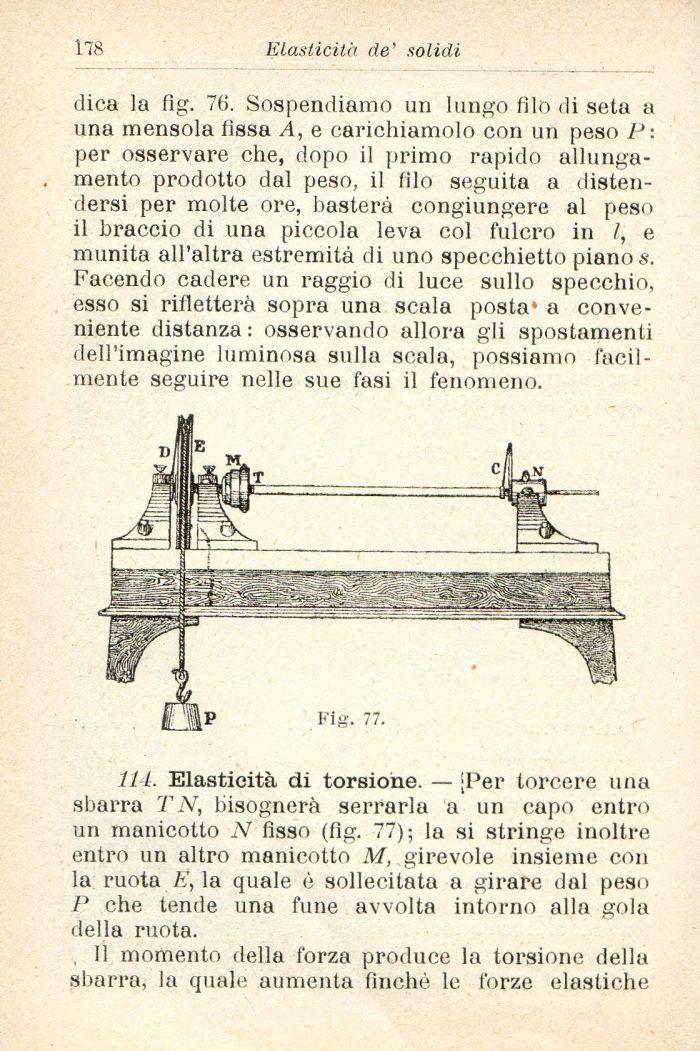 114. Elasticità di torsione. — [Per torcere una sbarra TN, bisognerà serrarla a un capo entro un manicotto N fisso (fig. 77); la si stringe inoltre entro un altro manicotto M, girevole insieme con la ruota E, la quale è sollecitata a girare dal peso P che tende una fune avvolta intorno alla gola della ruota.