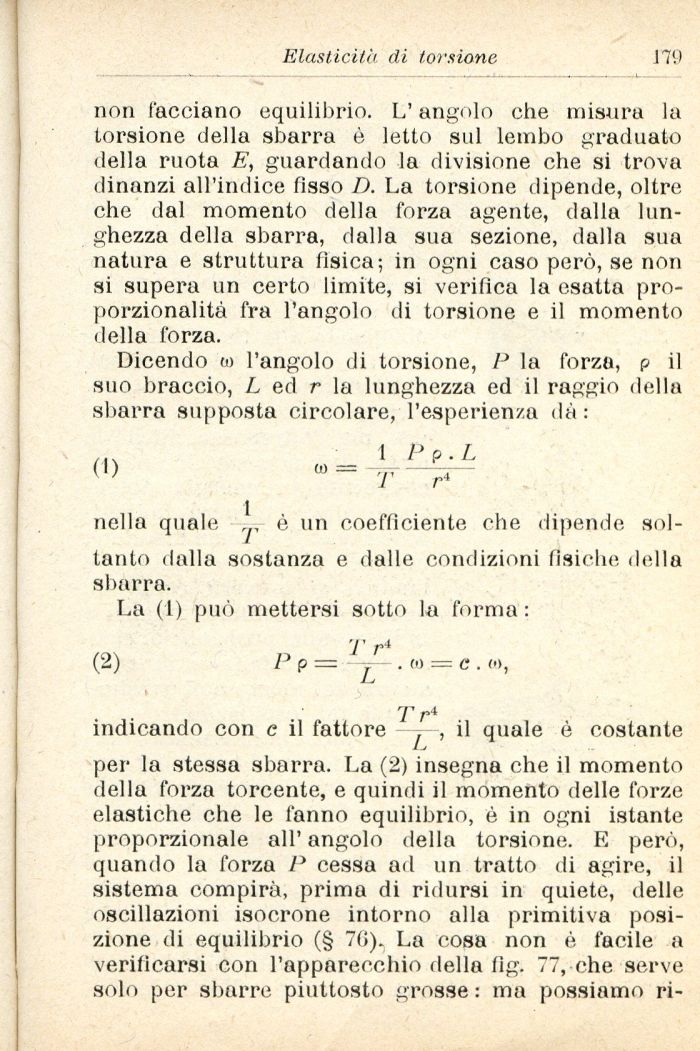 per la stessa sbarra. La (2) insegna che il momento della forza torcente, e quindi il momento delle forze elastiche che le fanno equilibrio, è in ogni istante proporzionale all' angolo della torsione. E però, quando la forza P cessa ad un tratto di agire, il sistema compirà, prima di ridursi in quiete, delle oscillazioni isocrone intorno alla primitiva posizione di equilibrio (§ 70). La cosa non è facile a verificarsi con l'apparecchio della fig. 77, che serve solo per sbarre piuttosto grosse : ma possiamo ri-