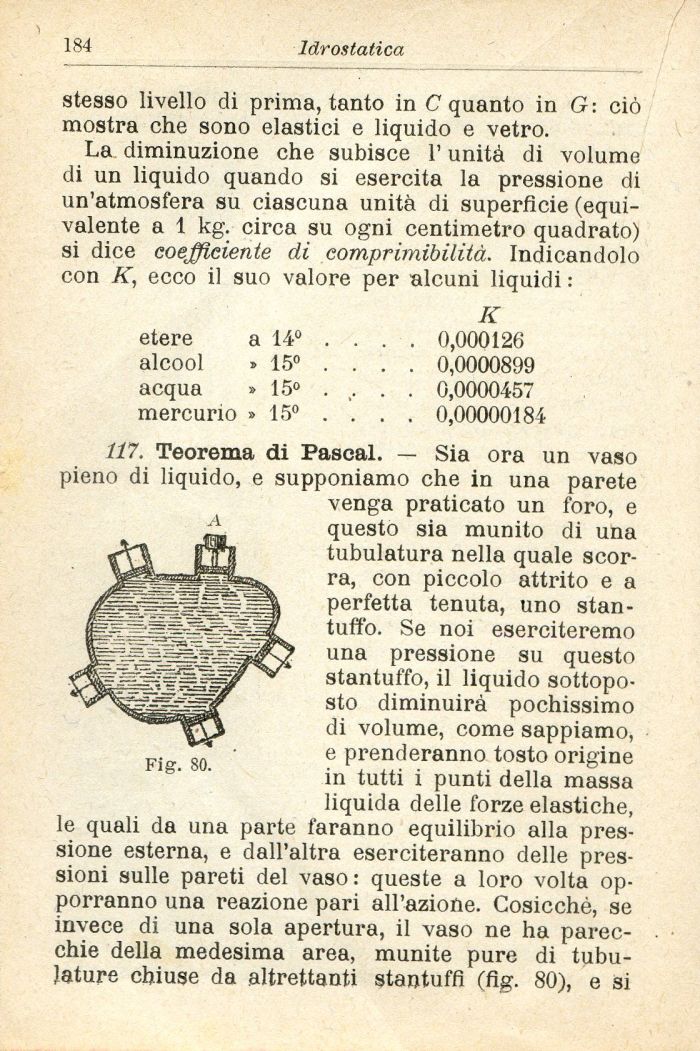 La diminuzione che subisce l'unita di volume di un liquido quando si esercita ia pressione di un'atmosfera su ciascuna unità di superficie (equivalente a 1 kg. circa su ogni centimetro quadrato) si dice coefficiente di comprimibilità. Indicandolo con K, ecco il suo valore per alcuni liquidi :
