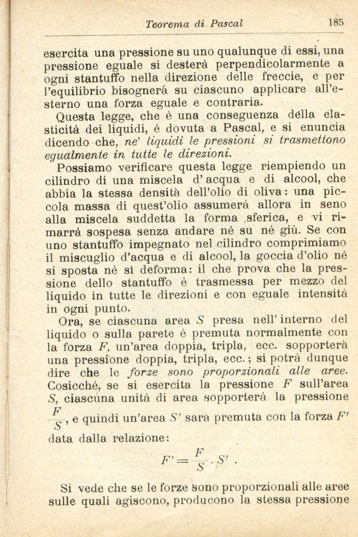 Ora, se ciascuna area S presa nell' interno del liquido o sulla parete è premuta normalmente con la forza F, un'area doppia, tripla, ecc. sopporterà una pressione doppia, tripla, ecc. ; si potrà dunque dire che le forze sono proporzionali alle aree. Cosicché, se si esercita la pressione F sull'area S, ciascuna unità di area sopporterà la pressione