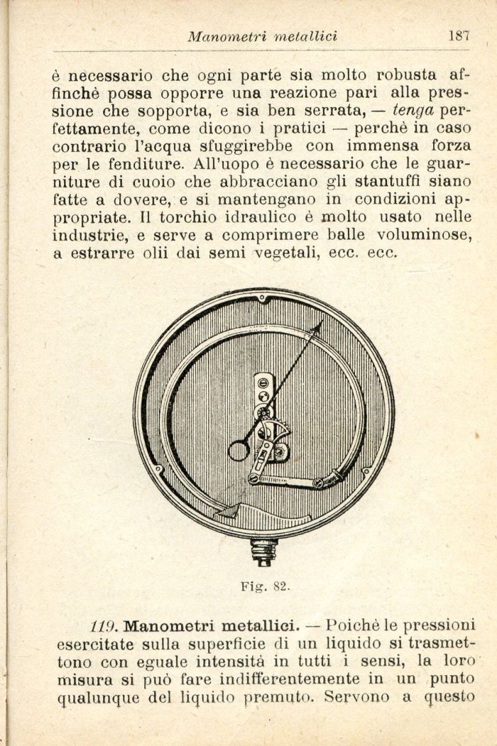 119. Manometri metallici. — Poiché le pressioni esercitate sulla superficie di un liquido si trasmettono con eguale intensità in tutti i sensi, la loro misura si può fare indifferentemente in un punto qualunque del liquido premuto. Servono a questo