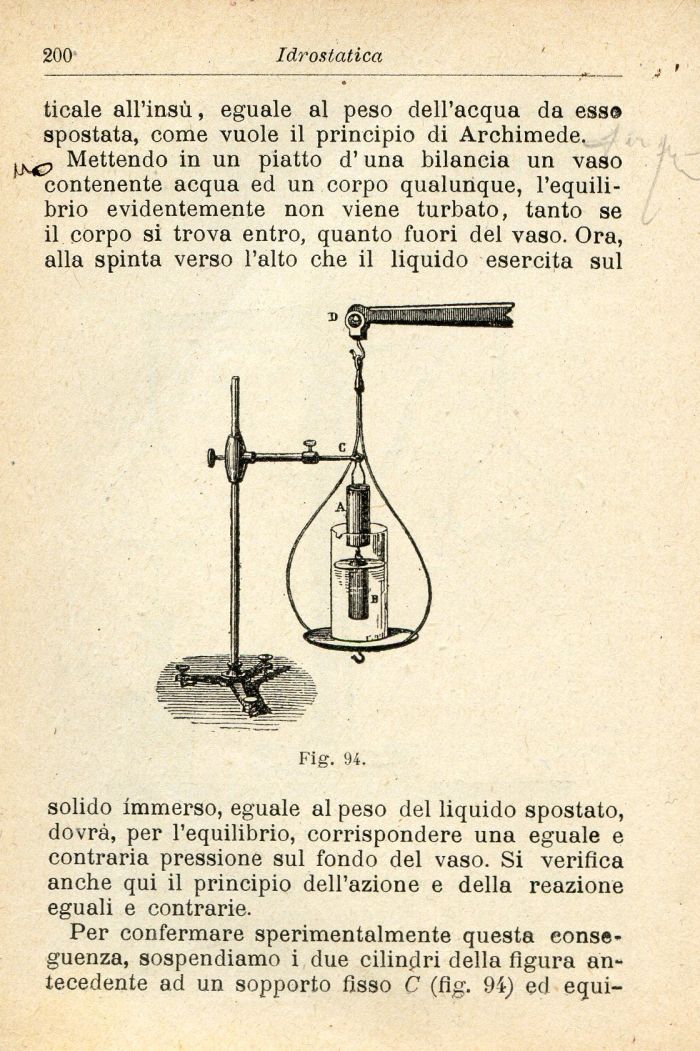 solido immerso, eguale al peso del liquido spostato, dovrà, per l'equilibrio, corrispondere una eguale e contraria pressione sul fondo del vaso. Si verifica anche qui il principio dell'azione e della reazione eguali e contrarie.