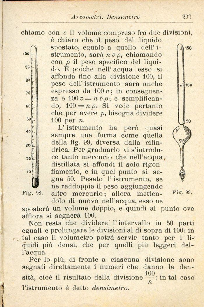 L'istrumento ha però quasi sempre una forma come quella della fig. 99, diversa dalla cilin-drica. Per graduarlo vi s'introduce tanto mercurio che nell'acqua, distillata si affondi il solo rigon--fiamenfo, e in quel punto si se- „ j, gna 50. Pesato l'istrumento, se v UP ne raddoppia il peso aggiungendo Fig. 98. altro mercurio ; allora metten- Fi8-
