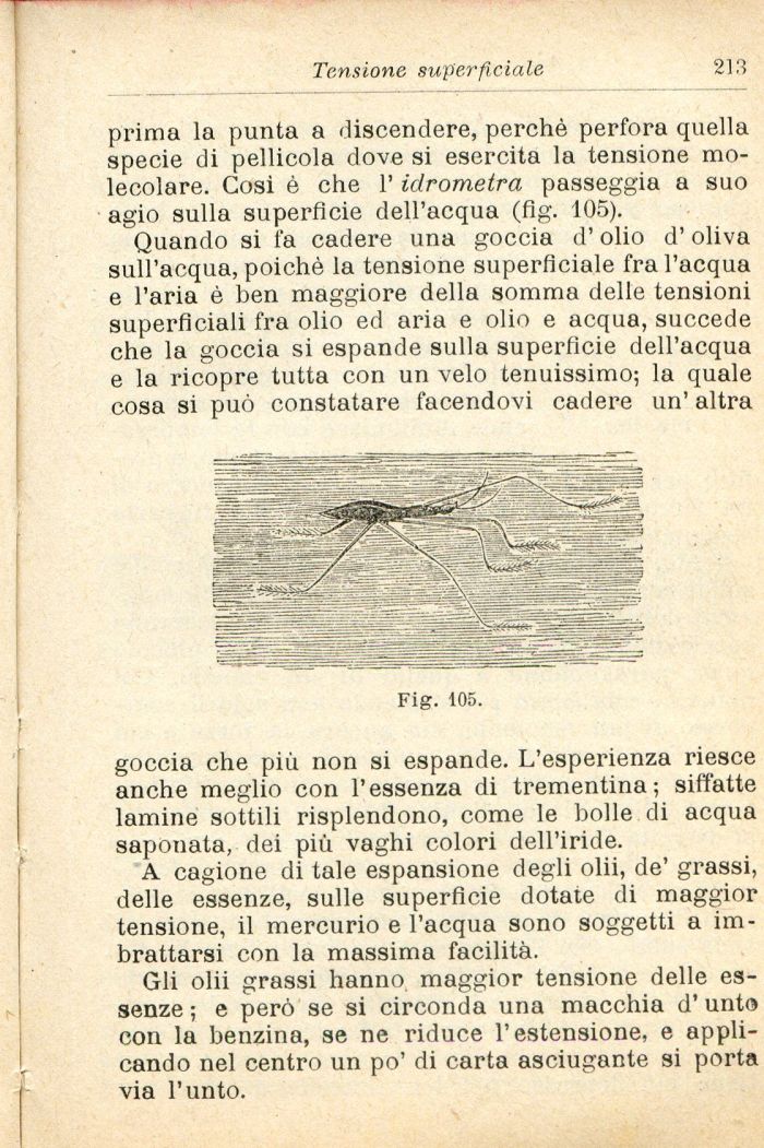 prima la punta a discendere, perchè perfora quella specie di pellicola dove si esercita la tensione molecolare. Cosi è che l'idrometra passeggia a suo agio sulla superfìcie dell'acqua (fig. 105).