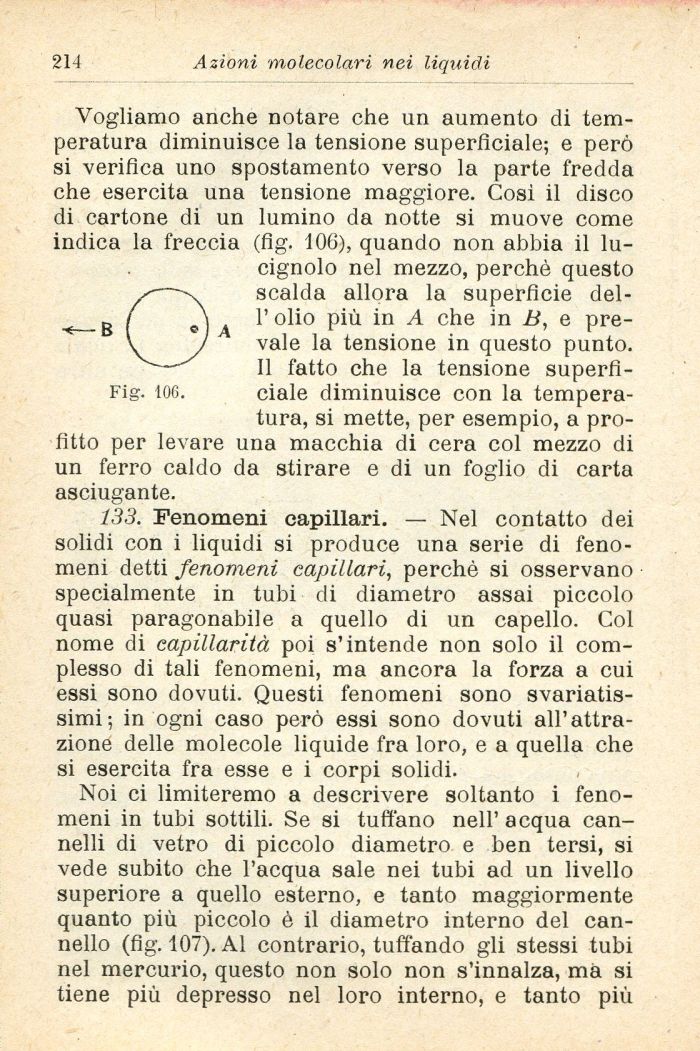 Vogliamo anche notare che un aumento di temperatura diminuisce la tensione superficiale; e però si verifica uno spostamento verso la parte fredda che esercita una tensione maggiore. Cosi il disco di cartone di un lumino da notte si muove come indica la freccia (fig. 106), quando non abbia il lucignolo nel mezzo, perchè questo