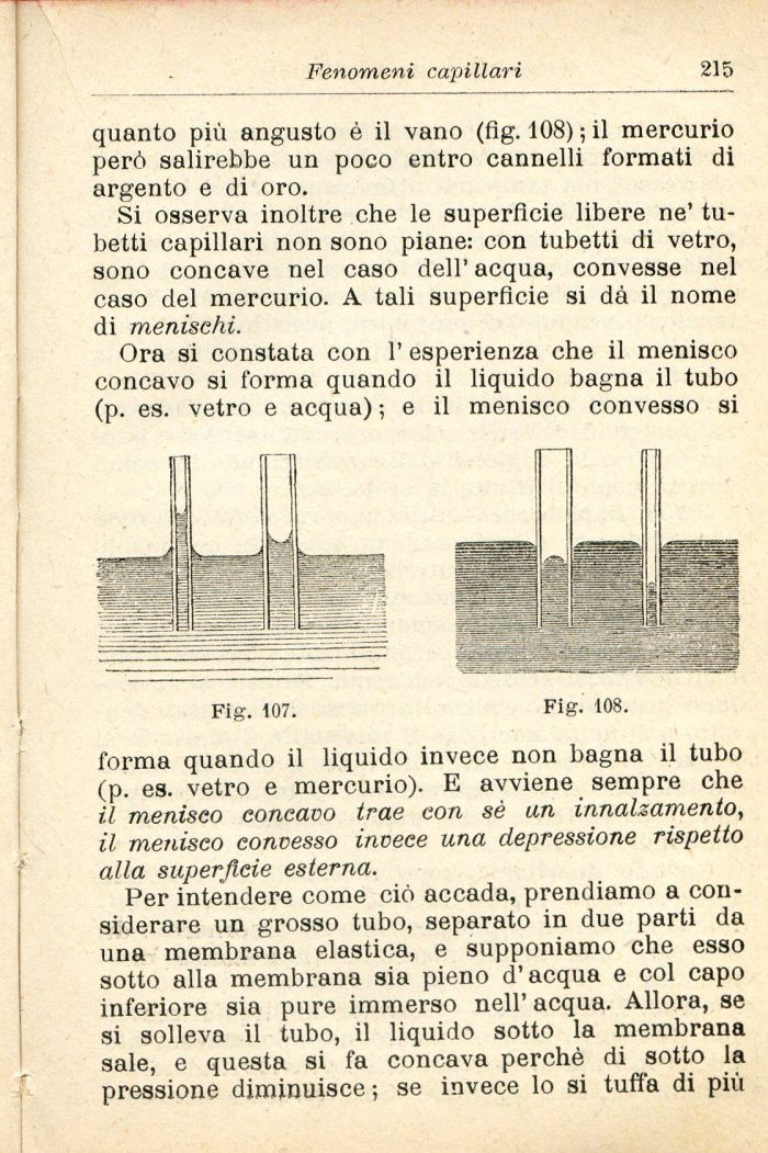 Si osserva inoltre che le superficie libere ne' tubetti capillari non sono piane: con tubetti di vetro, sono concave nel caso dell' acqua, convesse nel caso del mercurio. A tali superficie si da il nome di menischi.
